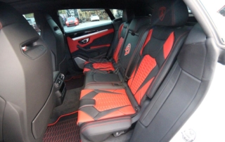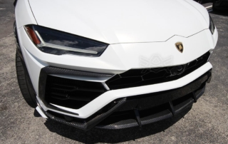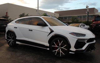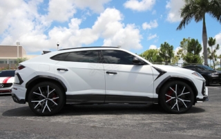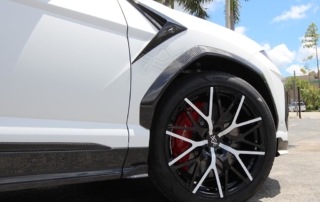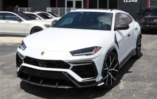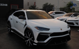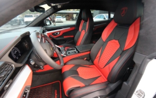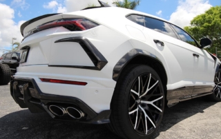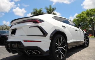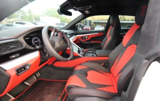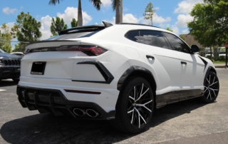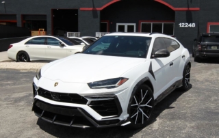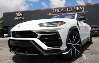 The new 2019 Lamborghini Urus. For a lot of us when we think back to 1993, we remember Jurassic Park, Michael Jackson performing at the Super Bowl, and Oprah’s interview with him 2 weeks later. Its one of the most watched interviews in the history of television. But there’s one thing a lot of us either forgot about or never knew existed and that’s the Lamborghini lm002. A fully capable off-road truck with military style and a v12 Countach motor under the hood. 1993 was the last year Lamborghini offered this truck and now 25 years later they have made history once more with the all new v8 twin turbo powered Urus. A four-door supercar with exceptional styling. However, we always find some room for improvement here at The Auto Firm. On this 2019 Urus for Great Friend Beto “Zumba” Perez we went with a full wrap in #m Satin Frozen Vanilla, painted gloss black accents and a full carbon fiber body kit. The carbon fiber kit is made by Topcar and replaces the factory rear diffuser, front splitter, fender flares, mirror caps and adds some carbon accents to other areas of the car. On the wheels we went with Avorza AV60 Forged Wheels with a gloss black and carbon fiber finish. We decided the wheel needed a little more contrast to bring the carbon to life and wrapped the center to match the vehicle. Inside is where the real magic went down. We gutted the whole interior from the seats to the dash. Drew up a new design that would bring out that supercar feel you get behind the wheel but still capture the luxurious style you would expect from a SUV of this caliber. A mix of red and black Italian leather with red accent stitching and custom hand-made black leather floor mats with honeycomb style red stitching and red accent pipping. With all these wonderful upgrades we just had to make sure the car would stay protected at all time so we went ahead and finished it off with a full Ceramic Pro Gold Package Ceramic coating inside and out.