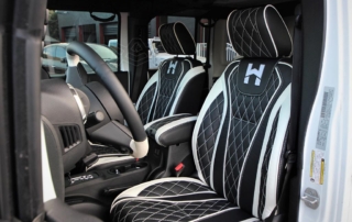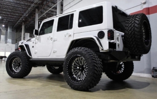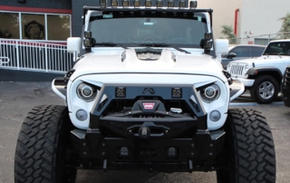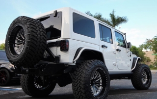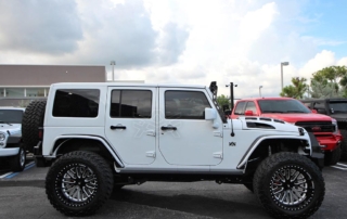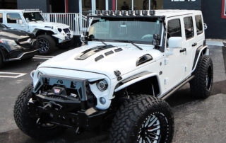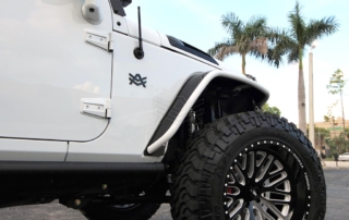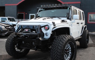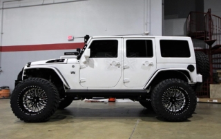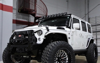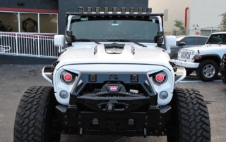 Jeep Wrangler done for Hassan Whiteside of the Miami Heat. Avorza AVF20C Offroad Forge Wheels 22×12 custom painted two colors, Gloss Black lip, Gloss Black face with White color match windows. Sitting on Nitto tires 37×13.50R22 Trail Grappler. DV8 Offroad hood, Model Heat Hood Jeep JK. Power Step by AMP Research with Light Part# 7512201A. Fab Fours front Stubby Winch Bumper Part# JK07B18551. Fab Fours Winch modifier Part# JK07B18591. Poison Spyder 1762020P1 RockBrawler II Rear Bumper with Tire Carrier in Spyder Shell Armor Coat. Warn 89305 Zeon 8-5 Winch with 100 Spydura Synthetic Rope and Hawse Fairlead. Poison Spyder JK Front Crusher Flares Part# 1703031. Poison Spyder JK Rear Crusher Flares Part# 1705010. Custom Red Devil Eye Headlights. Xprite Grill JK Gladiator Color Match. Factor 55-0001504 Prolink Winch Shackle Mount Assembly Black. Rugged Ridge 11229.05 Gas Cap. Rigid Industries LED Cubes D-Series Pro Midnight Edition Spot LED Part# 20221. Light Bar Top Pole with Brackets. Rigid Industries Double Lights Mounts Corner Cubes Part# 40335. Installed Air Horn Kit Part# 2005. Install RGB Underbody Lights. Installed HID Projectors. Installed Alpine HCE-C1100 Camera. Custom Made Interior Black and White.