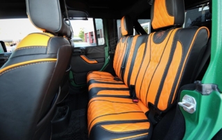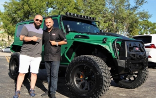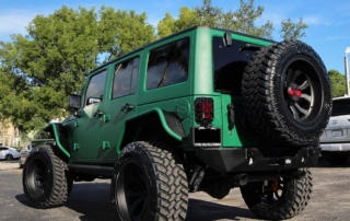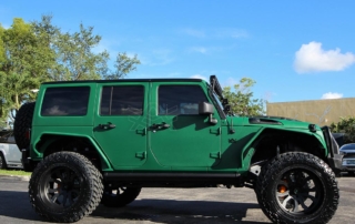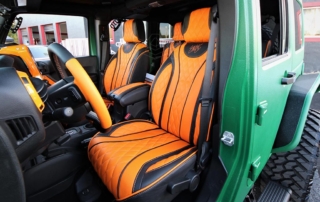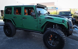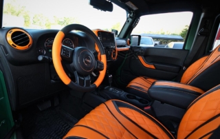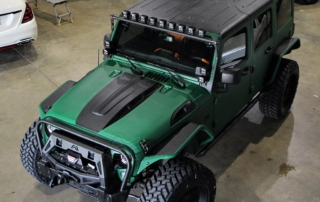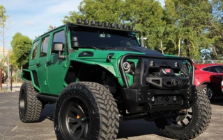 Jeep Wrangler done for Sandy Leon of the Boston Red Sox. Avorza AVFC4 Off-road Forged Wheels 22×12 Power Coating Satin Black Sitting on Nitto Tires 37×13.50 R22 Trail Grappler. DV8 Off-road Hood, Model Heat Hood Jeep JK. Magnaflow 3.8L Jeep exhaust Part# 15160. Custom Interior Lamborghini orange leather with black two tone color interior. Fab Fours front bumper winch mount Stubby Part# JK07B18561. Fab Fours winch modifier Part# JK07B18591. Factor 55 Loade Prolink Shackle Part# f550001504. Warn – Zeon 8-5 Recovery 8000 LB winch with Spydura synthetic rope Part# 89305. Rampage – Fuel door cover black Part# RPP 75007. Rugged Ridge – JK Spartan Grill black Part# RUG12034.01. Smittybilt XRC Flux flared front fender Part# S/B 76838. Smittybilt XRC Flux flared rear fender Part# S/B 76839. Power step by AMP Research with Lights Part#7512201A. Rigid Industries double lights pillar mount Part# RIG 40335. Rugged Ridge aluminum hood catch kit black Part# RUG 11210.11. Poison Spyder LED 2.5 white lights Part# PSC 4104300. Teraflex vacuum pump relocation bracket kit Part# TER 4403100. Recon smoked tail lights Part# 264234LED BK. Carolina Metal Masters – Brass knuckle grab handles. Poison Spyder 1762020P1 Rockbrawler II rear bumper with tire carrier shell armor coat. Custom Amber devil eye headlights. Rigid Industries LED cubes D-Series Pro midnight edition spot Part# 20221. Light bar top pole with brackets. Complete custom Paint Matte Green. Clifford 5806X remote start. DSM350 Smart Start module GPS. THCHD1 Directed Harness TR7 Module. Alpine radio I209 – WRA9. KCA – 001 Control Module. HCE – TCAM1 – WRA Spare Tire Camera. Alpine PSS-21WRA upgraded sound system. Rosen – headrest in black with silver stitching. BDS ADJ. control arms with Fox 4.5” Suspension Kit. Jeep JK 4.5” Front dual rate spring kit Part# 24010. Jeep JK 4.5” Rear dual rate spring kit Part# 24015. Fox 2.0 performance series reservoir Part# 985-24-011 and Part# 985-24-012. Fox ATS steering stabilizer Part#983-02-070. Jeep JK 4.5” Box kit Part# 014454. BDS Jeep JK exhaust extension kit Part#124314. BDS ADJ front track bar JK Part#124403. BDS Jeep JK rear adjustable track bar Part# 124408. BDS JK front ADJ LCA kit Part# 124332. JK front ADJ UCA kit Part# 124333. BDS JK rear ADJ LCA kit Part#124338. BDS Adjustable Flex with Rubber bushings Part#124337. JEEP JK 3.6L Pentastar SPS intercooled stage 2 system/installed Part#263A1003. Baer big brake system drilled/slotted JK rear Part#4402000B. Baer big brake system drilled/slotted JK front Part# 4401000B.