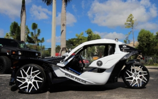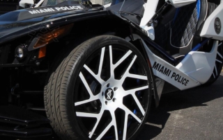 From 1982-1993 law enforcement officials had the Ford Mustang SSP (special service package) built by ford to serve as a light weight speedier option from the full-sized sedans on the market at that time. Over the years we’ve seen many changes with the vehicles used by our law enforcement. Now in 2018 they have AWD (all wheel drive) Dodge Charger SRT Hellcat in the works as well. It seems like every year more and more cars are coming out of the factory pushing a ridiculous amount of power so it makes sense that officers would need something with a little more power just to level the playing field. But what about a vehicle that isn’t made with the idea of assisting in a high-speed chase or special bust but instead made with the idea of bringing the community and those who protect it closer together? That’s where Polaris Industries, Whelen, Avorza and us come into play. Miami Police contacted us with an idea. They saw a slingshot we did for singer Luis Fonsi and wanted one of their own not to chase bad guys but instead to chase for a closer community and help mend the relationship between civilians and officers. Its something about the Slingshot that just draws everyone’s attention and the experience of riding one is unforgettable. The Slingshots design gives it that aggressive f1 car look and feel. Weighing only 1749 pounds with 173hp on a 5-speed manual transmission they are just as fast as they look. We had to find a way to keep those characteristics while still resembling a cop car style. black and white was obviously the color combo for this build with a custom pearl blue as the accent color on the roll bars. on the interior we went with the sport seats and reupholstered them with a diamond stitch pattern and blue accent. The steering wheel was changed to an Assault industries Ballistic D-shape steering wheel with blue accents. in order to change the steering wheel, you need to change the hub. In this build we went with Assault Aftermarket Steering Hub Adapter. On the exterior we added a roof and tastefully placed the Miami Police decals all over the bike and carefully mounted all the Whelen lights and sirens any police car can dream of. It had the perfect amount of red and blue lights with white strobes on the front, roof, and rear. The sirens and lights along with the style of the Polaris Slingshot were sure to be enough to get the communities attention and help start up conversations between our youth and law enforcement anywhere it went but the Avorza AV57 Forged Wheels is the icing on the cake. The AV57 has a directional design creating the illusion of movement. When the wheel is in motion it appears as if it is moving in reverse catching your eye as it zooms passed you on the street. The all white face and black inside just add that element of fun and excitement to the bike making it feel more inviting and approachable. I can’t wait to see this Slingshot on the streets and at events all across Miami. In the short time we had it at the shop every customer that came would say “WOW What’s that?” or “Man if that’s what cops get to drive I want to be one.” So, there’s no doubt in my mind that this will do great in creating a long-lasting relationship between our officers and our community. it was a great experience to be able to build something like this and a special thanks to Polaris Industries and Whelen for donating a Slingshot, lights and sirens for this build. We donated the work from paint to installation cause there’s nothing better then giving back to your own community.